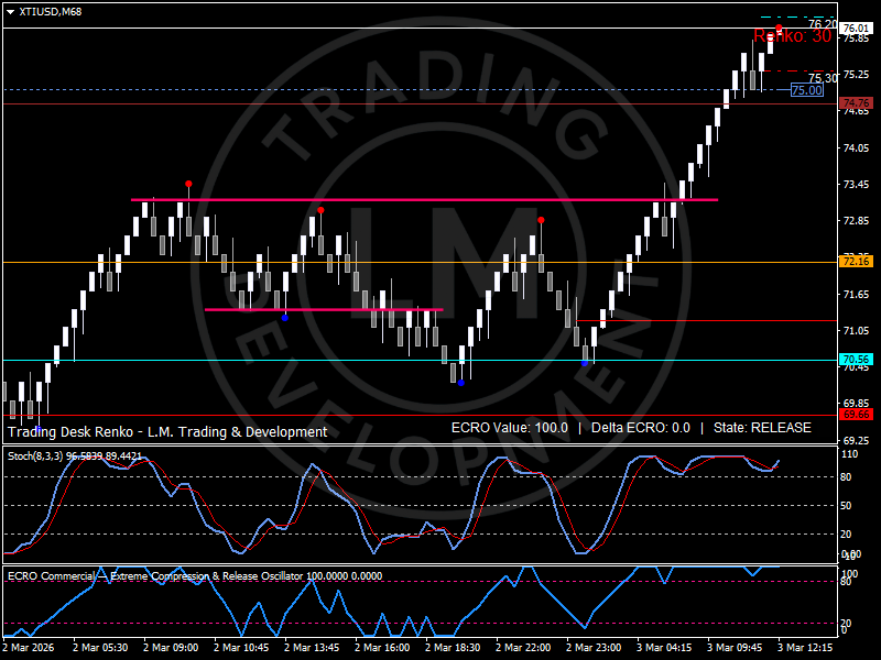 The current Renko 30 structure in WTI crude shows a decisive transition from the prior compression phase into a clear expansion regime.